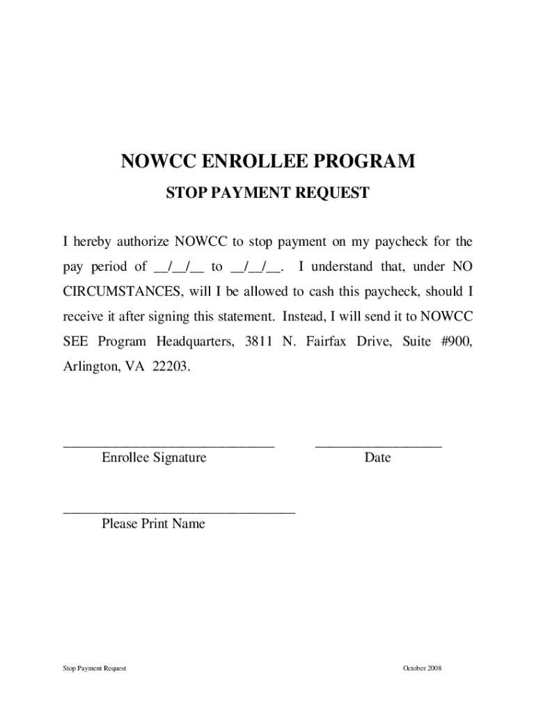 Get the free I hereby authorize NOWCC SEE Program to stop payment on my paycheck for the pay peri...