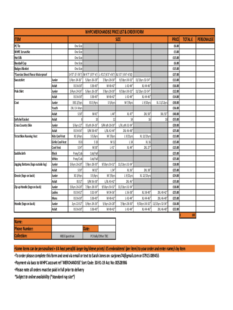 HPC MERCHANDISE PRICE LIST & ORDER FORM SIDESTEP PC Tie HPC Scrunchie Hat Silk Baseball Cap Badges Blanket *Exercise Sheet Fleece Waterproof Sweatshirt Polo Shirt CoatSoftshell Jacket Cross Country