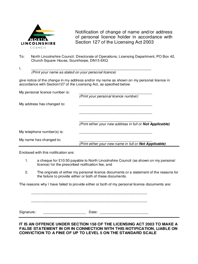Notification of change of name and/or address of personal license holder in accordance with Section 127 of the Licensing Act 2003 To:North Lincolnshire Council, Directorate of Operations, Licensing