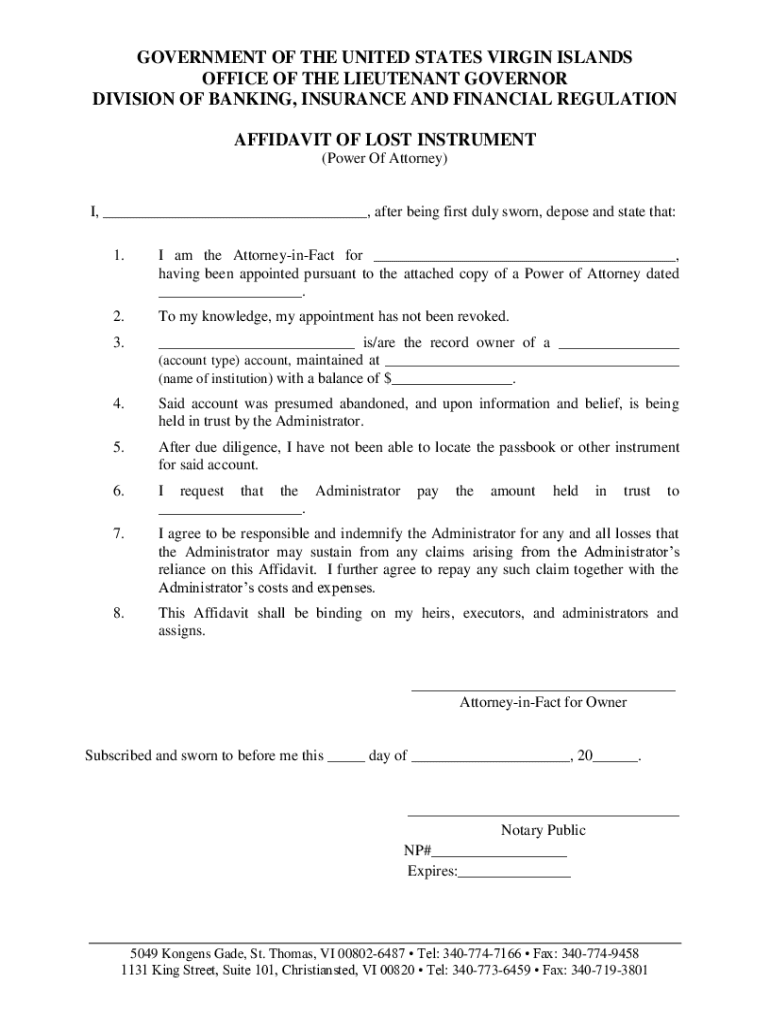 GOVERNMENT OF THE UNITED STATES VIRGIN ISLANDS OFFICE OF THE LIEUTENANT GOVERNOR DIVISION OF BANKING, INSURANCE AND FINANCIAL REGULATION AFFIDAVIT OF LOST INSTRUMENT (Power Of Attorney)I, after being