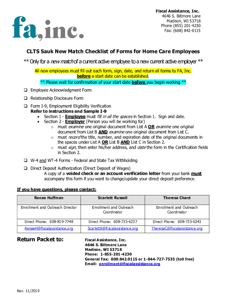 Fiscal Assistance, Inc. 4646 S. Biltmore Lane Madison, WI 53718 Phone (855) 2014230 Fax: (608) 8420115CLTS Sank New Match Checklist of Forms for Home Care Employees** Only for a new match of a current