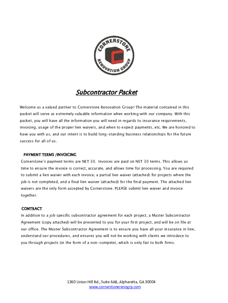 Subcontractor Packet Welcome as a valued partner to Cornerstone Renovation Group! The material contained in this packet will serve as extremely valuable information when working with our company.