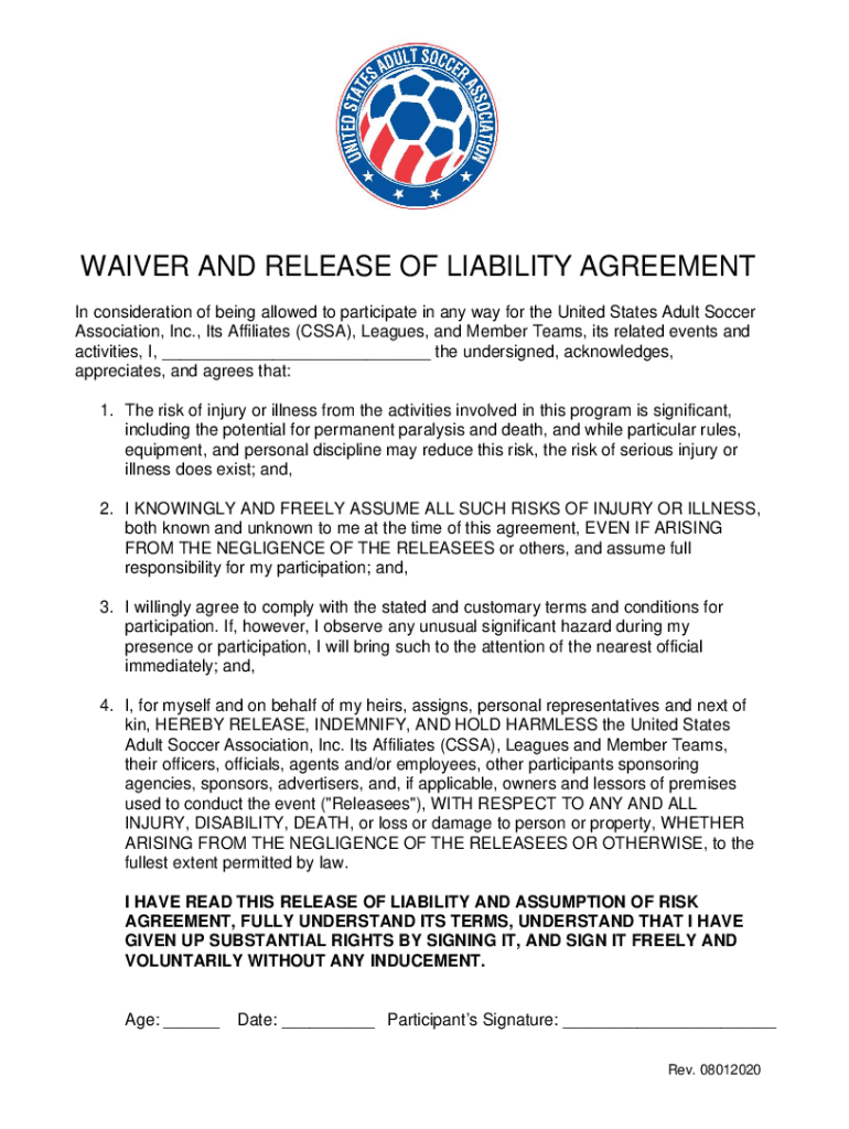 WAIVER AND RELEASE OF LIABILITY AGREEMENT In consideration of being allowed to participate in any way for the United States Adult Soccer Association, Inc., Its Affiliates (CSS), Leagues, and Member