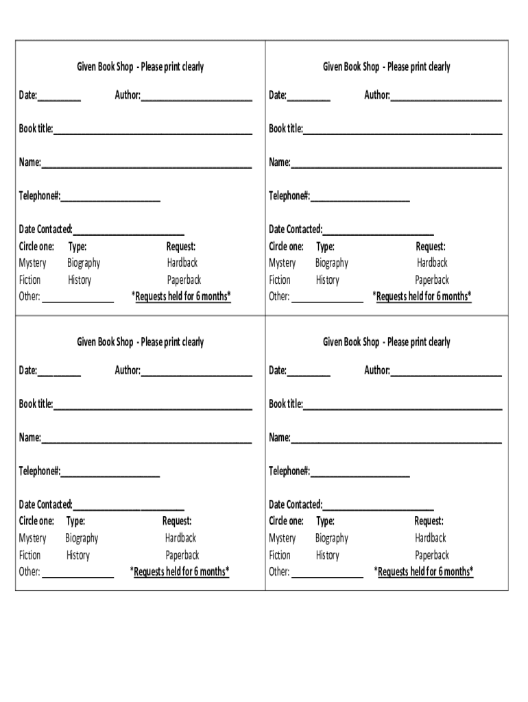 Given Book Shop Please print clearly Date: Author: Given Book Shop Please print clearly Date: Author: Book title: Book title: Name: Name: Telephone#: Telephone#: Date Contacted: Circle one: Type: