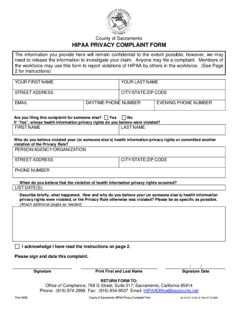 County of SacramentoHIPAA PRIVACY COMPLAINT From The information you provide here will remain confidential to the extent possible; however, we may need to release the information to investigate your