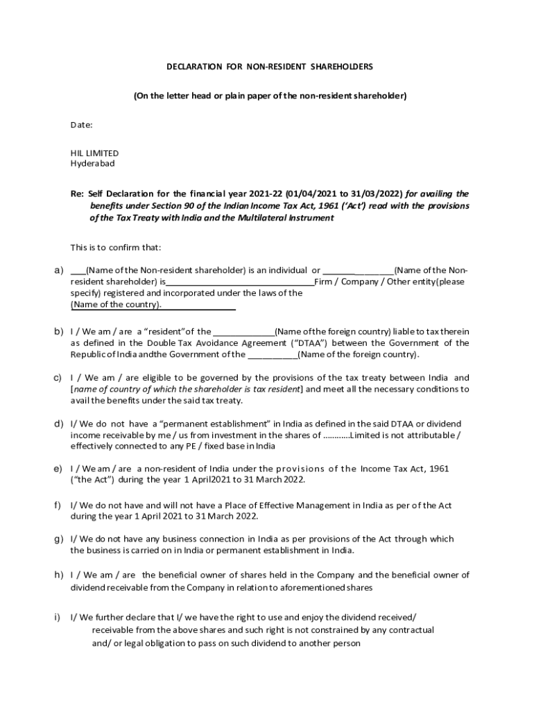 DECLARATION FOR NONRESIDENT SHAREHOLDERS (On the letter head or plain paper of the nonresident shareholder) Date: HIS LIMITED Hyderabad Re: Self Declaration for the financial year 202122 (01/04/2021