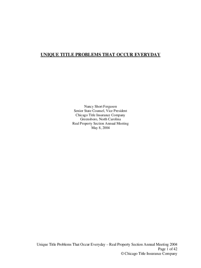 UNIQUE TITLE PROBLEMS THAT OCCUR EVERYDAY Nancy Short Ferguson Senior State Counsel, Vice President Chicago Title Insurance Company Greensboro, North Carolina Real Property Section Annual Meeting