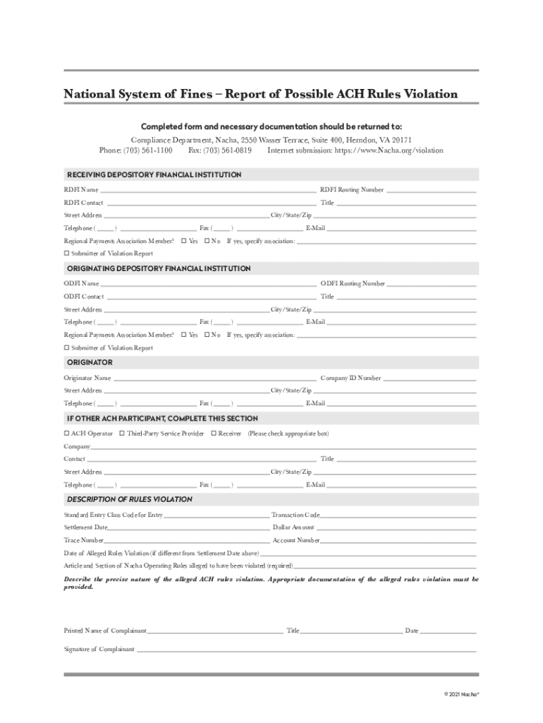 National System of Fines Report of Possible ACH Rules Violation Completed form and necessary documentation should be returned to: Compliance Department, NACA, 2550 Passer Terrace, Suite 400, Herndon,