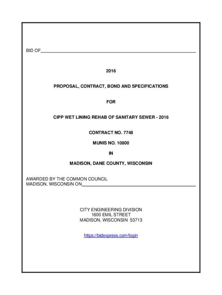 BID OF2016PROPOSAL, CONTRACT, BOND AND SPECIFICATIONSFORCIPP WET LINING REHAB OF SANITARY SEWER 2016CONTRACT NO. 7748 TUNIS NO. 10800 IN MADISON, DANE COUNTY, WISCONSINAWARDED BY THE COMMON COUNCIL