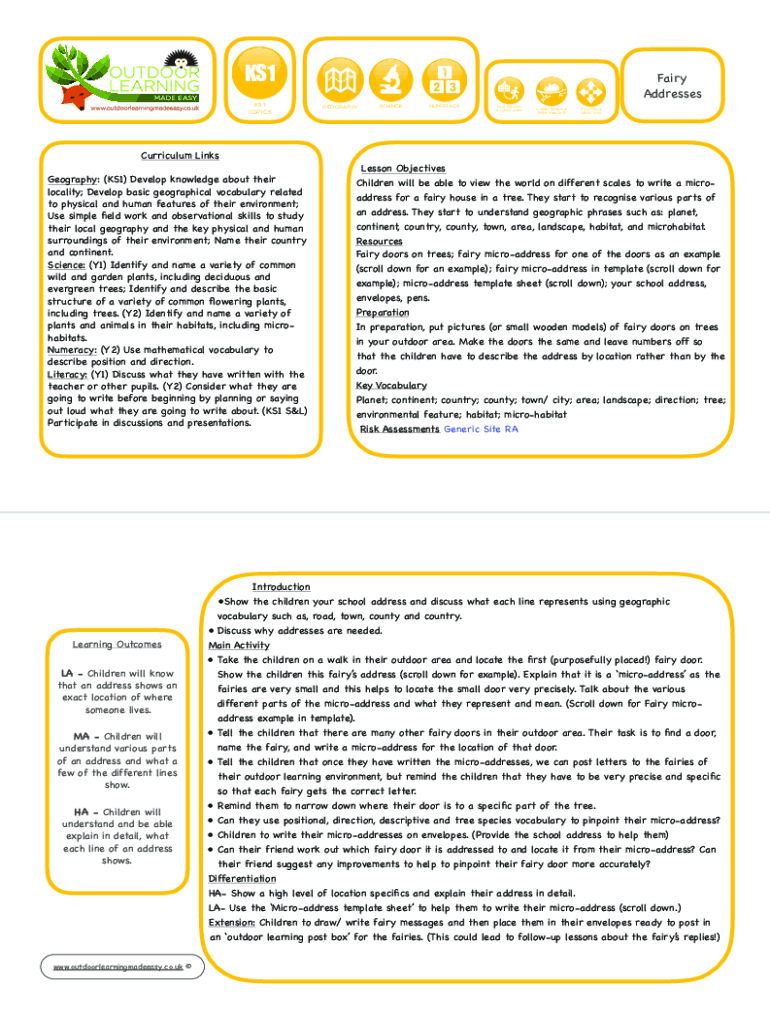 KS1 TOPICSFairy Addresses GEOGRAPHYSCIENCENUMERACYOUR SCHOOL & LOCAL REALIZING THINGS & THEIR HABITATSPOSITION & DIRECTIONCurriculum LinksGeography: (KS1) Develop knowledge about their locality; Develop