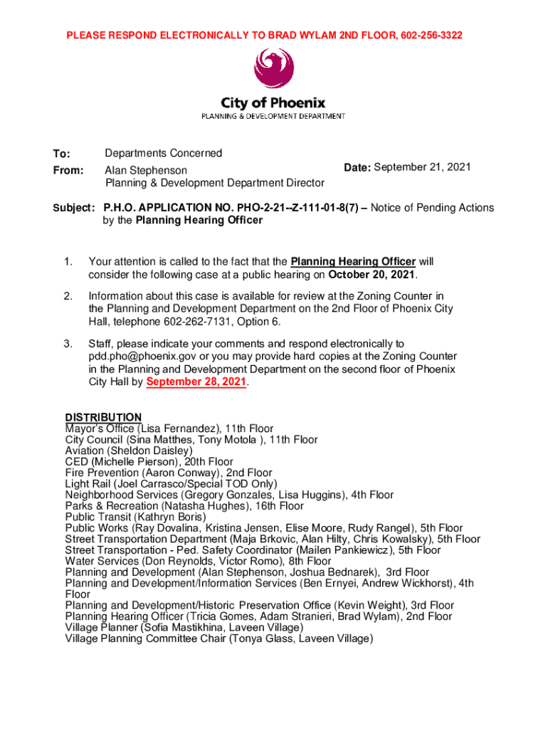 PLEASE RESPOND ELECTRONICALLY TO BRAD ISLAM 2ND FLOOR, 6022563322To: From:Departments Concerned Alan Stephenson Planning & Development Department Directorate: September 21, 2021Subject: P.H.O. APPLICATION