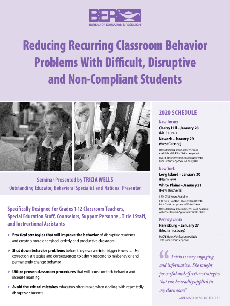 Reducing Recurring Classroom Behavior Problems With Difficult, Disruptive and NonCompliant Students 2020 SCHEDULE New Jersey Cherry Hill January 28 (Mt. Laurel) Newark January 29 (West Orange) NJ