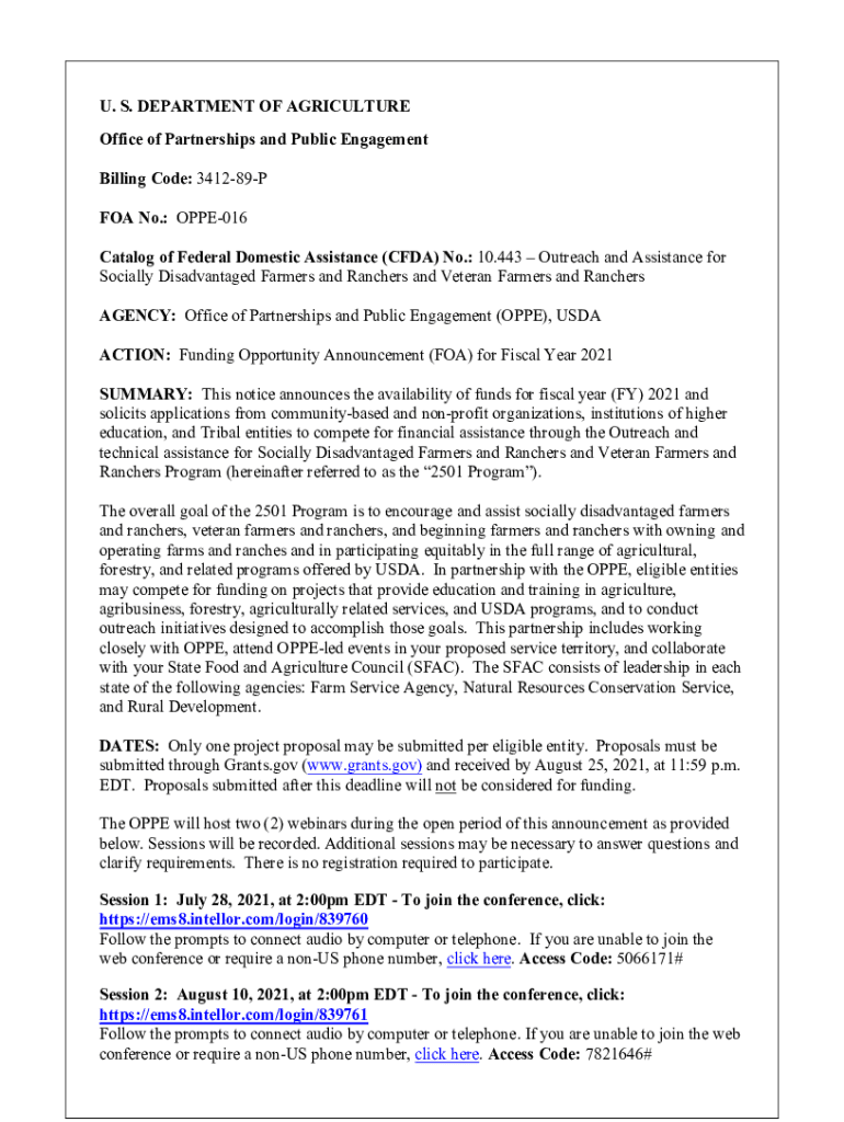U. S. DEPARTMENT OF AGRICULTURE Office of Partnerships and Public Engagement Billing Code: 341289P FOA No.: OPPE016 Catalog of Federal Domestic Assistance (CODA) No.: 10.443 Outreach and Assistance