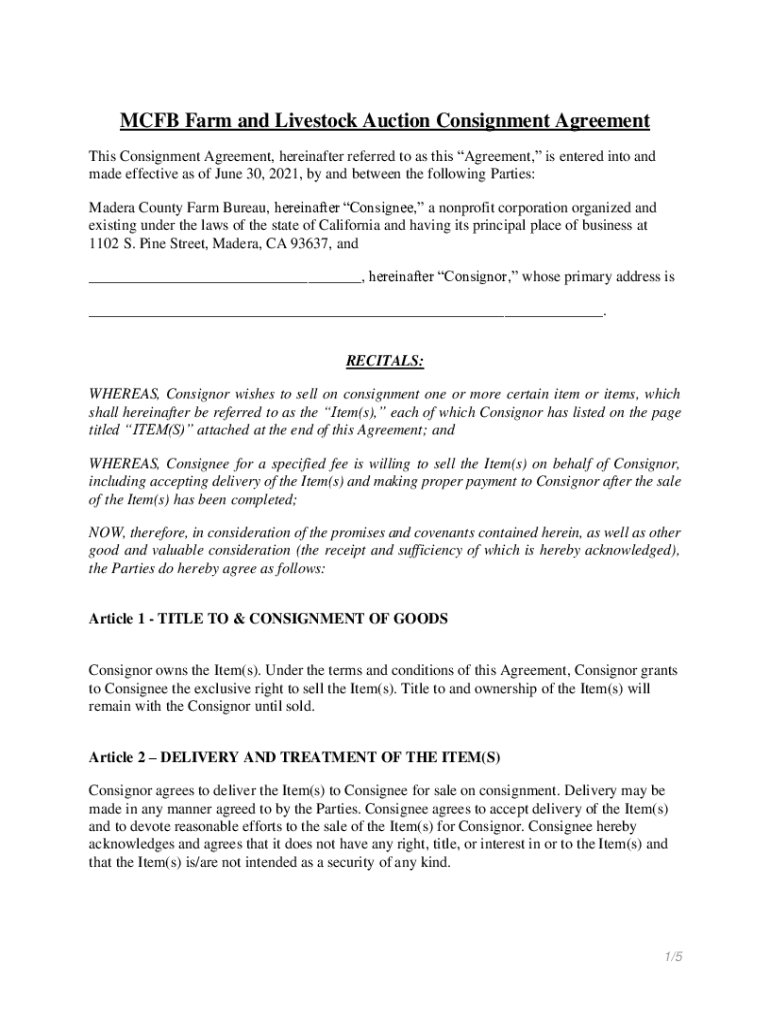 CFB Farm and Livestock Auction Consignment Agreement This Consignment Agreement, hereinafter referred to as this Agreement, is entered into and made effective as of June 30, 2021, by and between the