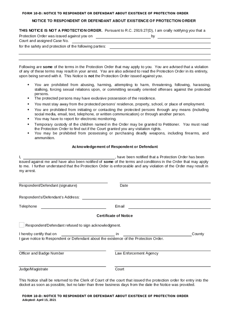 What is 10-D Notice to Respondent or Defendant About Existence of Protection Order Form?