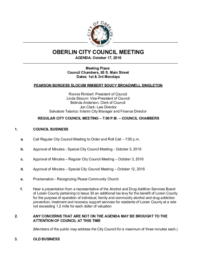 OBERLIN CITY COUNCIL MEETING AGENDA: October 17, 2016, Meeting Place: Council Chambers, 85 S. Main Street Dates: 1st & 3rd Mondays PEARSON BURGESS SLOCUM ROBERT SAUCY BROADWAY SINGLETON Ronnie Robert: