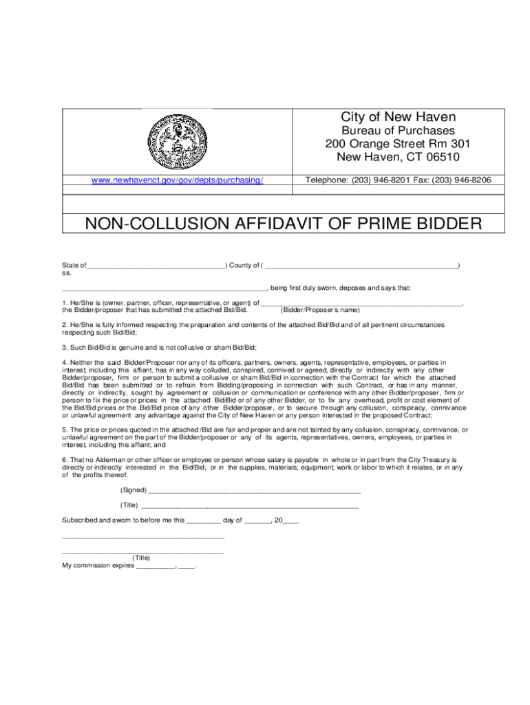 City of New Haven Bureau of Purchases 200 Orange Street Rm 301 New Haven, CT 06510 www.newhavenct.gov/gov/depts/purchasing/Telephone: (203) 9468201 Fax: (203) 9468206NONCOLLUSION AFFIDAVIT OF PRIME