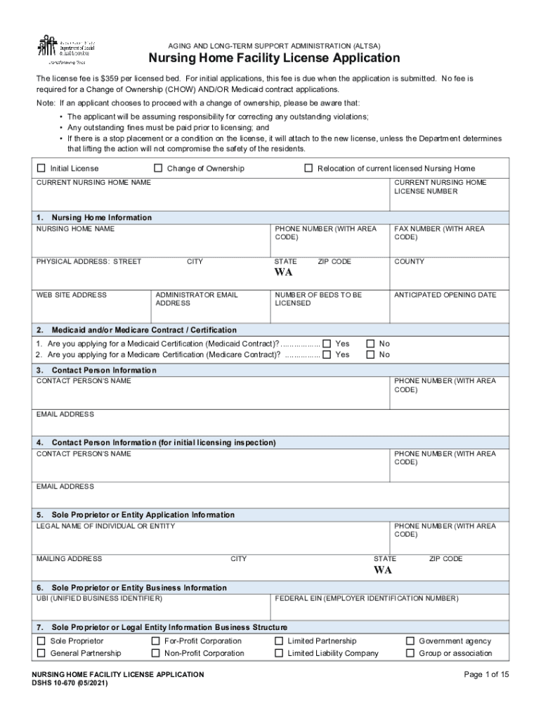 AGING AND LONGER SUPPORT ADMINISTRATION (ALTA)Nursing Home Facility License Application The license fee is $359 per licensed bed. For initial applications, this fee is due when the application is