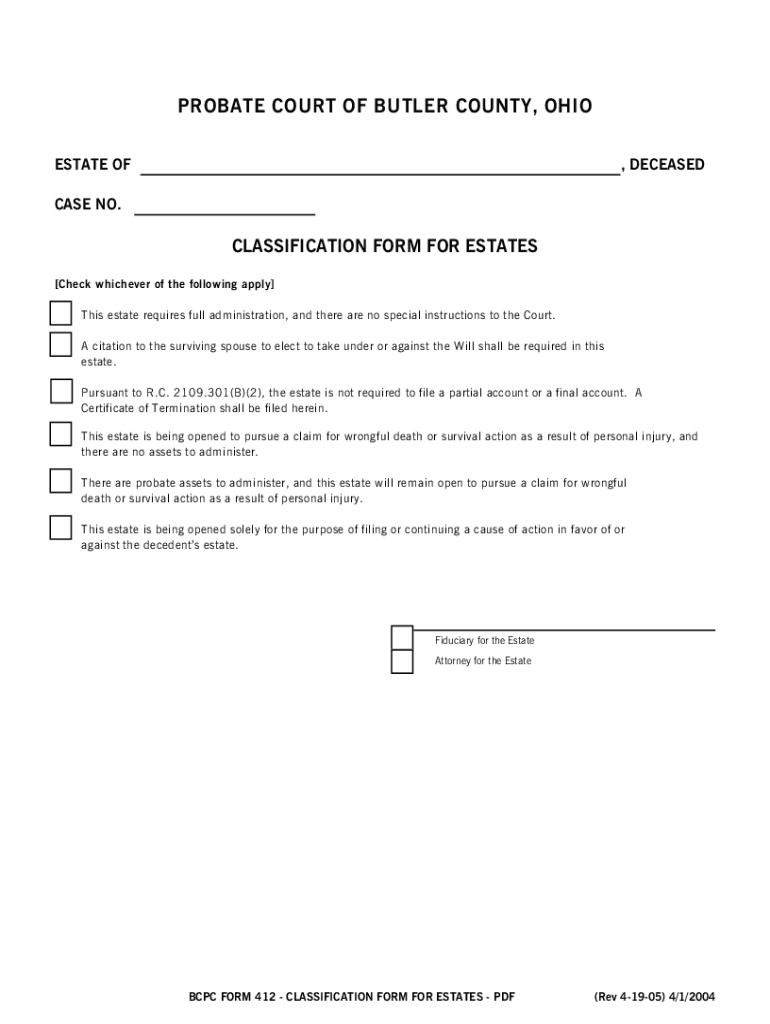 PROBATE COURT OF BUTLER COUNTY, OHIO ESTATE OF, DECEASED CASE NO.CLASSIFICATION FORM FOR ESTATES Check whichever of the following apply This estate requires full administration, and there are no special