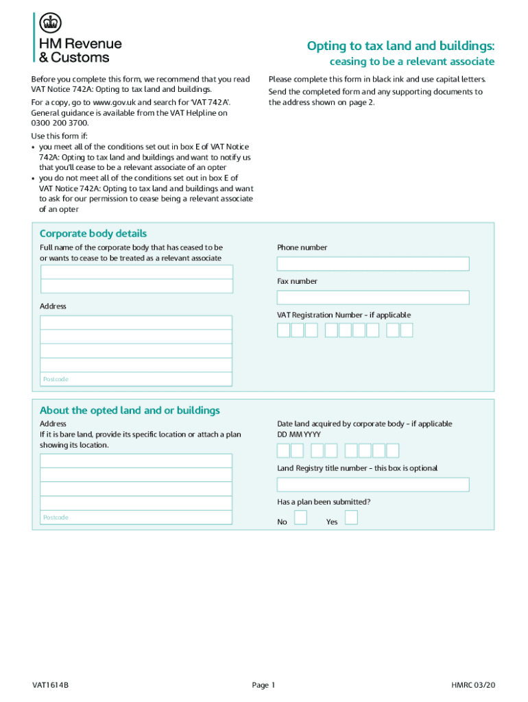 Opting to tax land and buildings: ceasing to be a relevant associate Before you complete this form, we recommend that you read VAT Notice 742A: Opting to tax land and buildings. Please complete this
