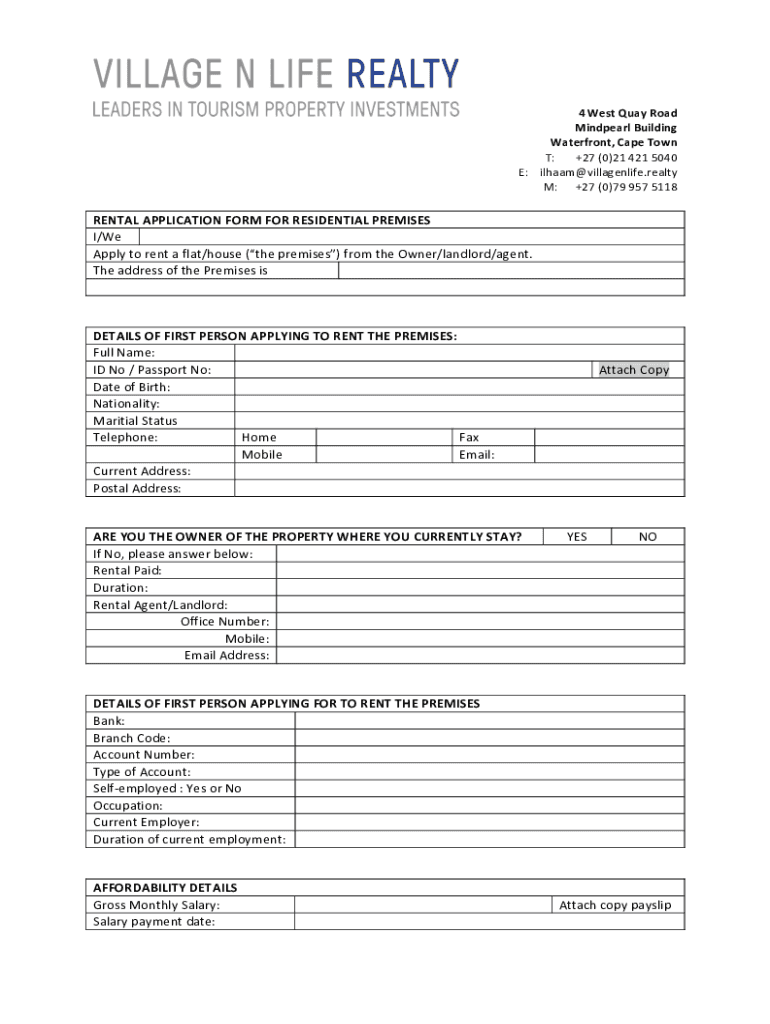 4 West Quay RoadMindpearl BuildingWaterfront, Cape Town:+27 (0)21 421 5040E:ilhaam@villagenlife.realty:+27 (0)79 957 5118RENTAL APPLICATION FORM FOR RESIDENTIAL PREMISES/Reapply to rent a flat/house