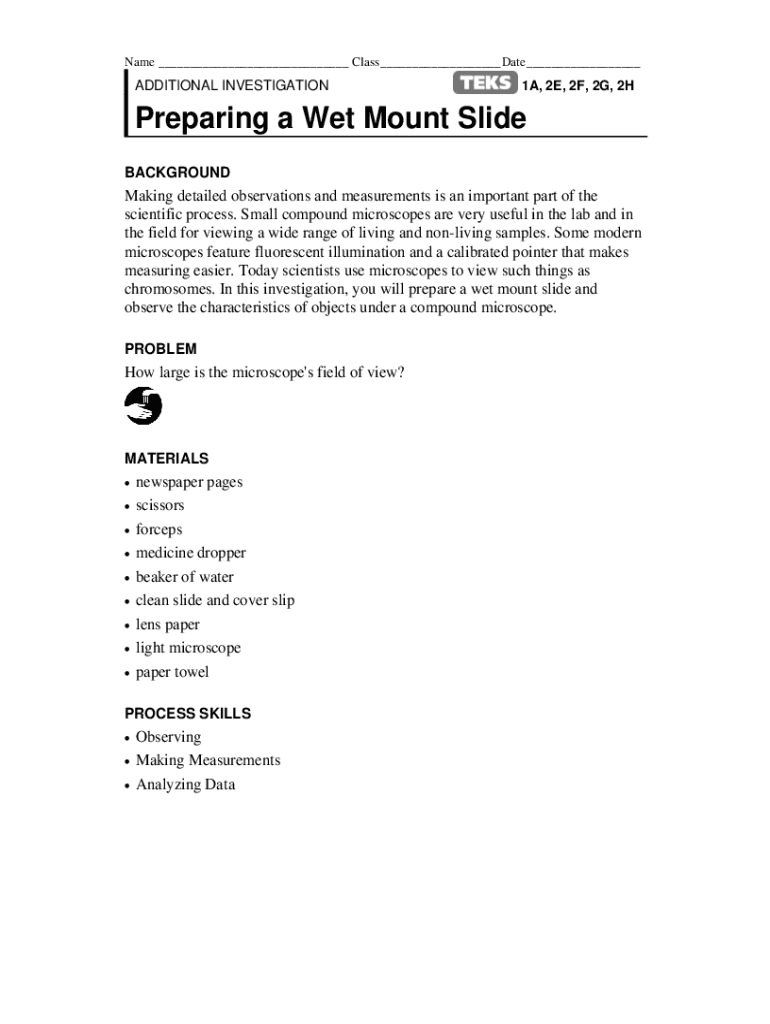 Name Class Date ADDITIONAL INVESTIGATION1A, 2E, 2F, 2G, 2HPreparing a Wet Mount Slide BACKGROUNDMaking detailed observations and measurements is an important part of the scientific process. Small
