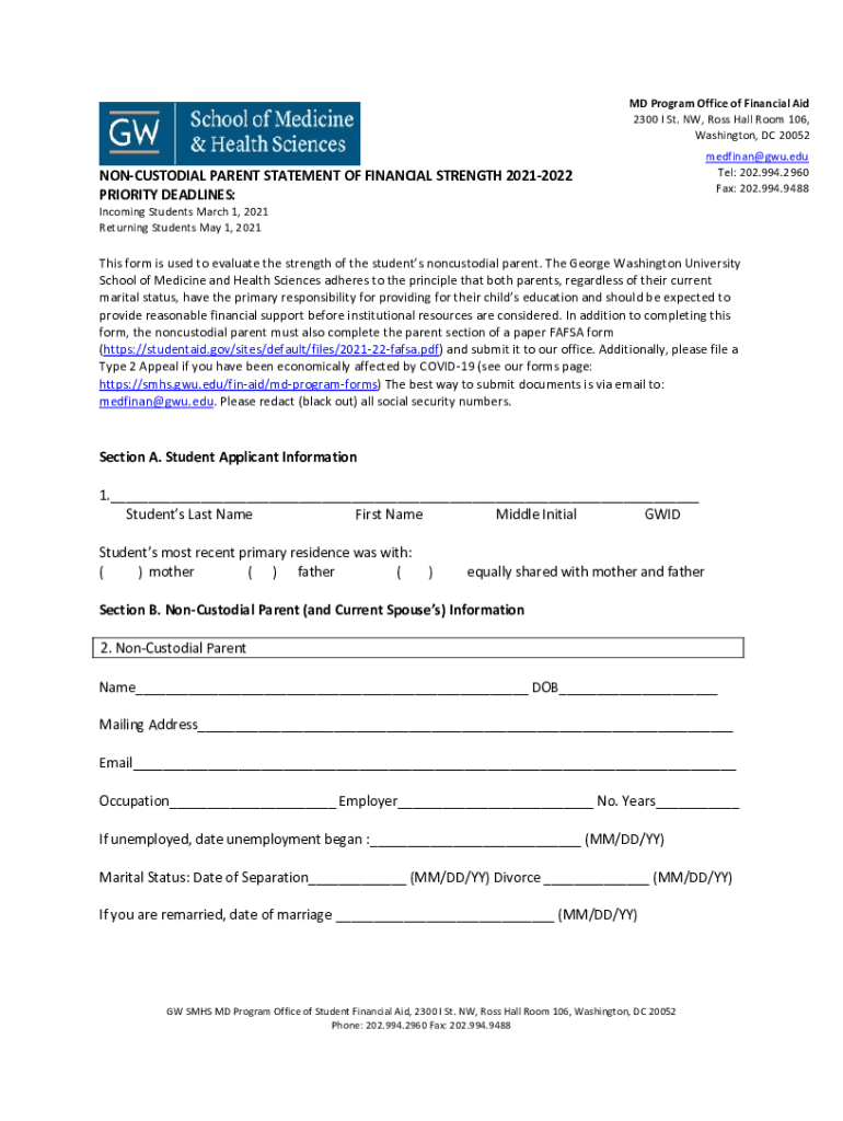 GW IMD Program Office of Financial Aid 2300 I St. NW, Ross Hall Room 106, Washington, DC 20052School of Medicine & Health SciencesNONCUSTODIAL PARENT STATEMENT OF FINANCIAL STRENGTH 20212022 PRIORITY