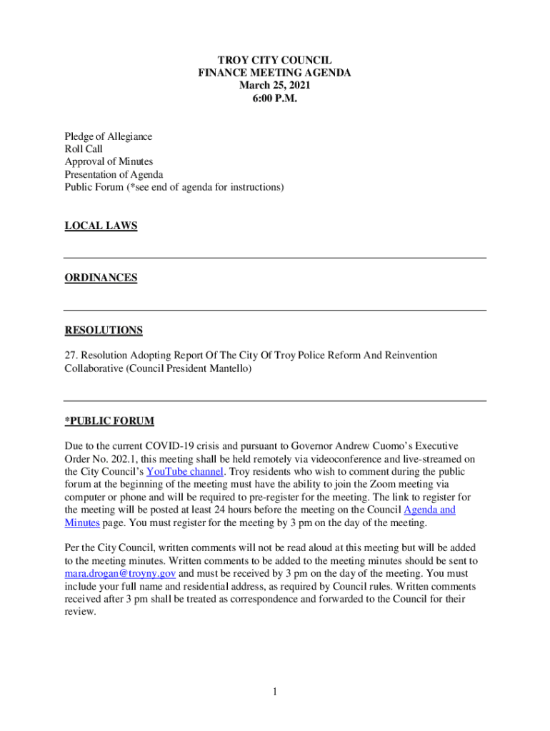 TROY CITY COUNCIL FINANCE MEETING AGENDA March 25, 2021 6:00 P.M. Pledge of Allegiance Roll Call Approval of Minutes Presentation of Agenda Public Forum (*see end of agenda for instructions)LOCAL