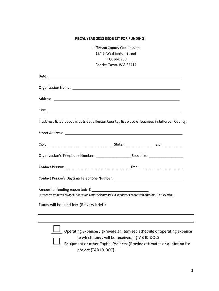 FISCAL YEAR 2012 REQUEST FOR FUNDING Jefferson County Commission 124 E. Washington Street P. O. Box 250 Charles Town, WV 25414 Date: Organization Name: Address: City: If address listed above is outside