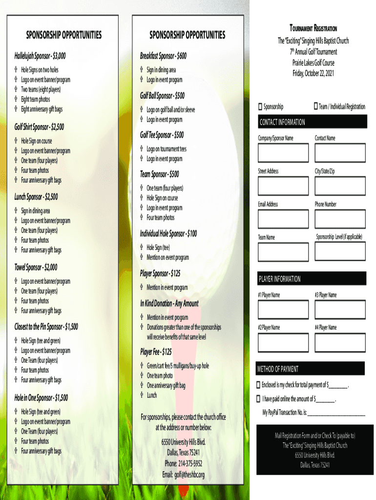 SPONSORSHIP OPPORTUNITIES Hallelujah Sponsor $3,000Breakfast Sponsor $600Sign in dining area Logo in event programmable Signs on two holes Logo on event banner/program Two teams (eight players) Eight