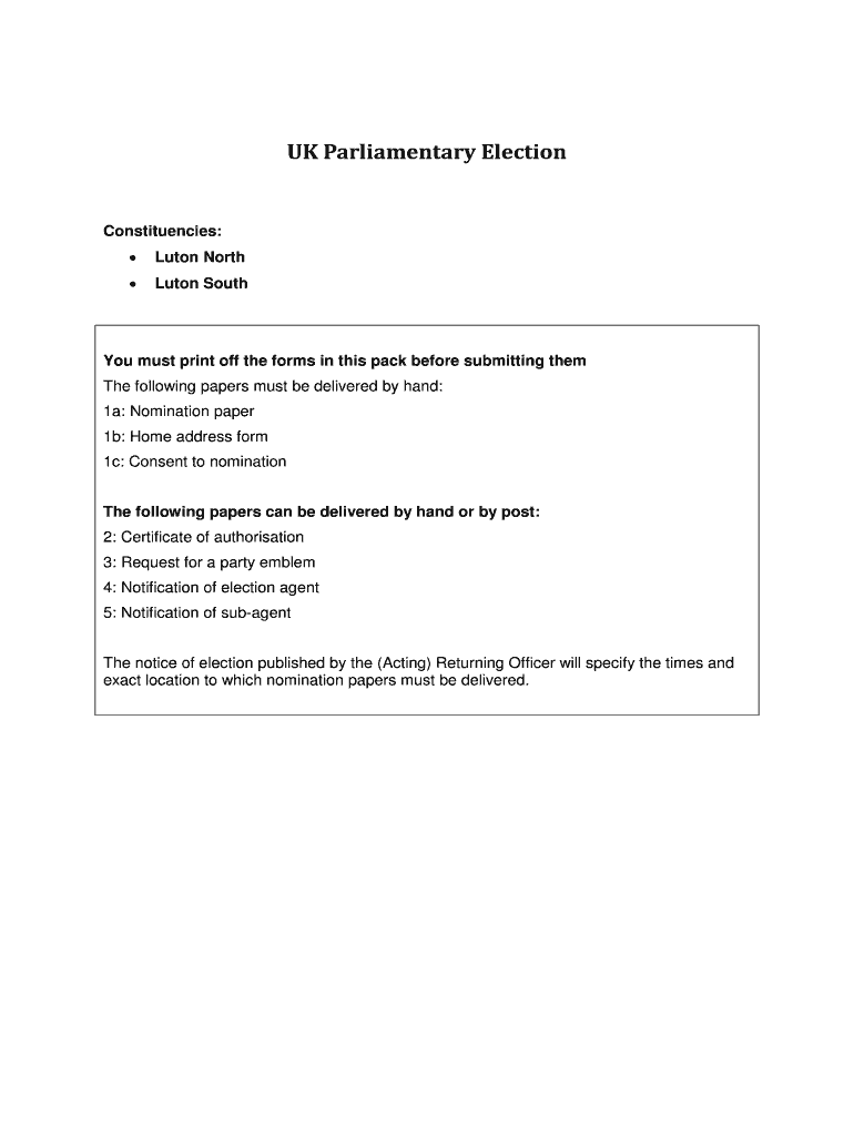 UK Parliamentary Election Constituencies: Luzon North Luzon South You must print off the forms in this pack before submitting them The following papers must be delivered by hand: 1a: Nomination paper