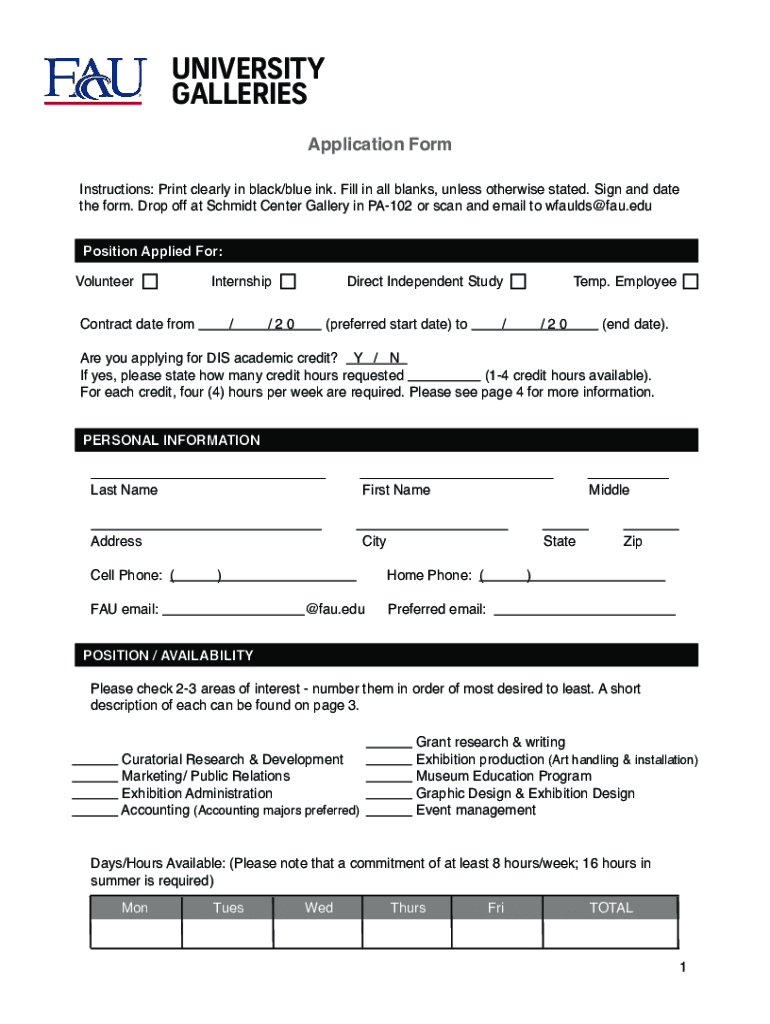 UNIVERSITY GALLERIES Application Form Instructions: Print clearly in black/blue ink. Fill in all blanks, unless otherwise stated. Sign and date the form. Drop off at Schmidt Center Gallery in PA102