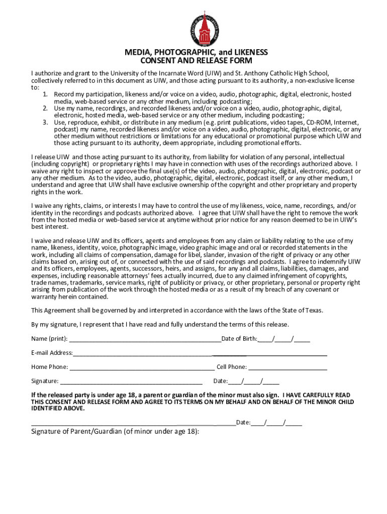 MEDIA, PHOTOGRAPHIC, and LIKENESS CONSENT AND RELEASE FORM I authorize and grant to the University of the Incarnate Word (UAW) and St. Anthony Catholic High School, collectively referred to in this