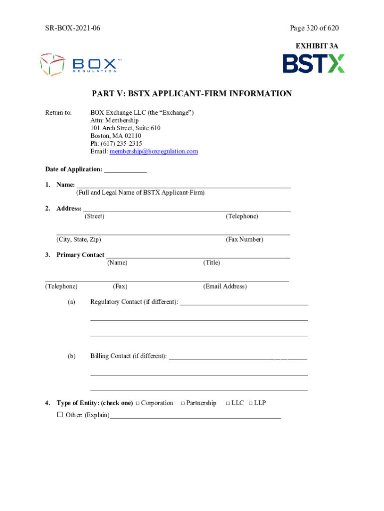 SRBOX202106Page 320 of 620 EXHIBIT 3APART V: BST APPLICANTFIRM INFORMATION Return to:BOX Exchange LLC (the Exchange) Attn: Membership 101 Arch Street, Suite 610 Boston, MA 02110 pH: (617) 2352315