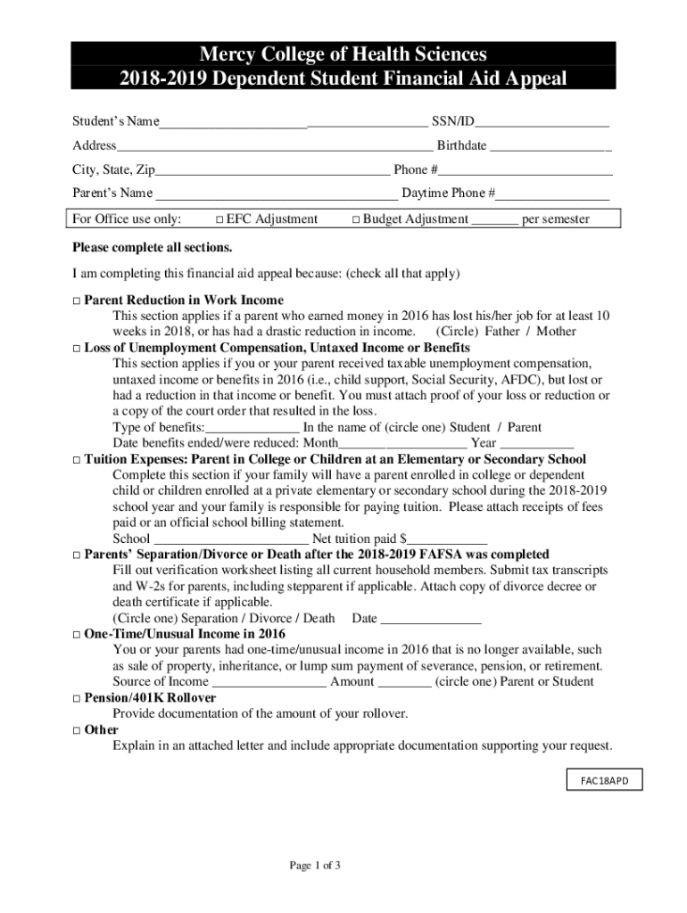 Mercy College of Health Sciences 20182019 Dependent Student Financial Aid Appeal Students Name SSN/ID Address Birthdate City, State, Zip Phone # Parents Name Daytime Phone # For Office use only: EFC