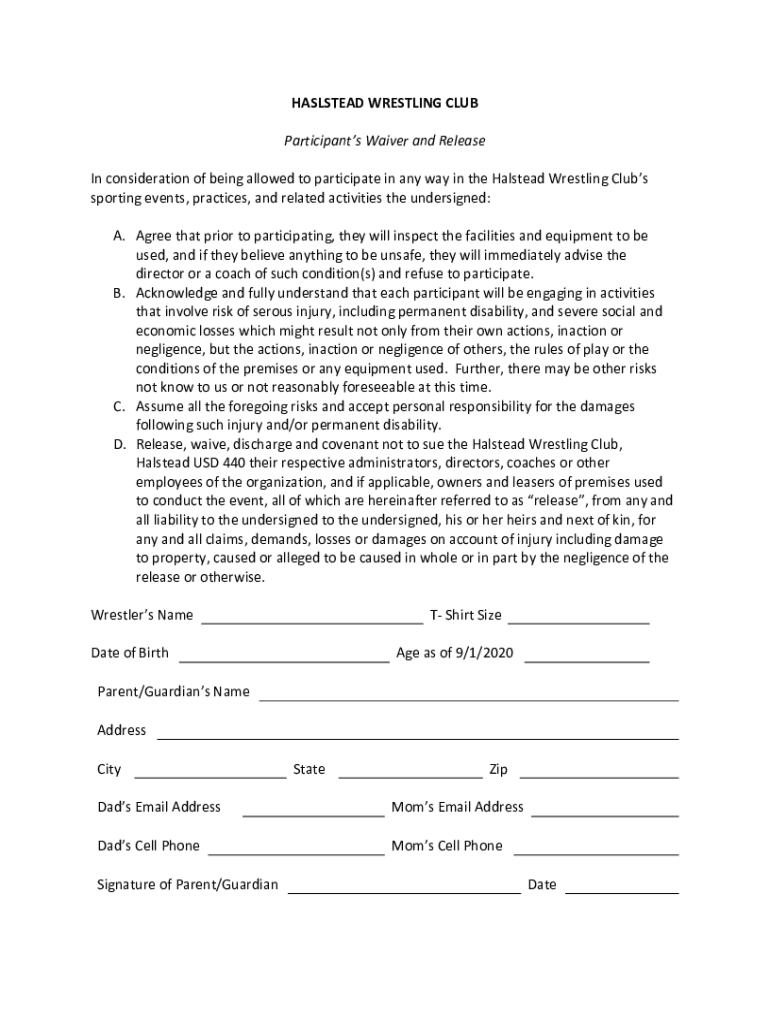HALSTEAD WRESTLING CLUB Participants Waiver and Release In consideration of being allowed to participate in any way in the Halstead Wrestling Clubs sporting events, practices, and related activities