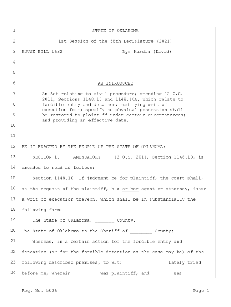 1STATE OF OKLAHOMA21st Session of the 58th Legislature (2021)3HOUSE BILL 1632By: Hardin (David)4 5 6 7 8 9AS INTRODUCED An Act relating to civil procedure; amending 12 O.S. 2011, Sections 1148.10