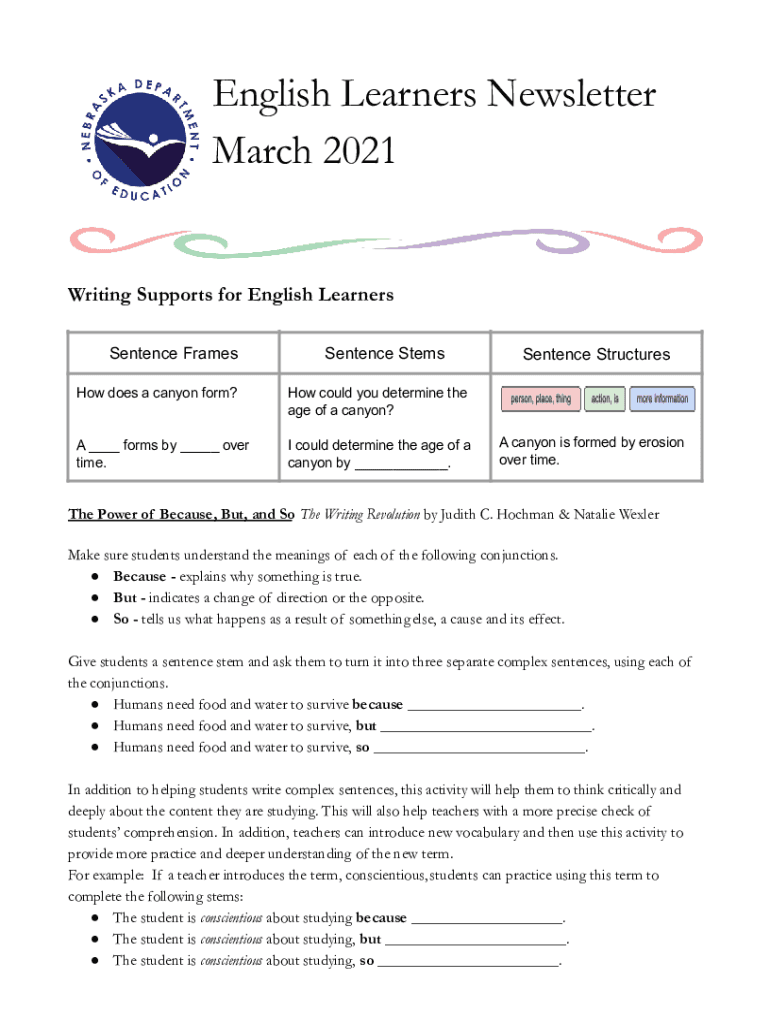 English Learners Newsletter March 2021Writing Supports for English Learners Sentence FramesSentence Steslow does a canyon form? How could you determine the age of a canyon? A form by over time. I