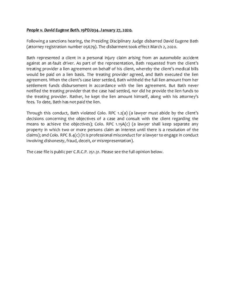 People v. David Eugene Bath. 19PDJ034. January 27, 2020. Following a sanctions hearing, the Presiding Disciplinary Judge disbarred David Eugene Bath (attorney registration number 05679). The disbarment