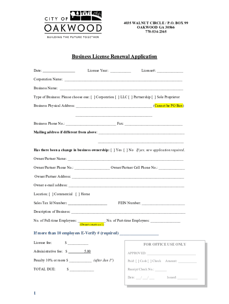 4035 WALNUT CIRCLE / P.O. BOX 99 LAKEWOOD GA 30566 7705342365Business License Renewal Application Date:License Year: License#: Corporation Name: Business Name: Type of Business: Please choose one: