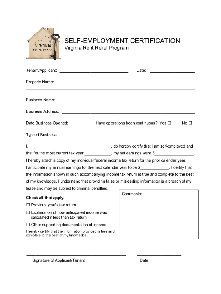 REEMPLOYMENT CERTIFICATION Virginia Rent Relief ProgramTenant/Applicant: Date: Property Name: Business Name: Business Address: Date Business Opened: Have operations been continuous?: Yes No Type of