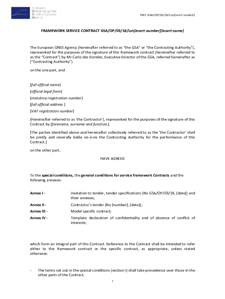 FCC GSA/OP/03/18/Lot insert number FRAMEWORK SERVICE CONTRACT GSA/OP/03/18/Lot insert number insert name The European GNSS Agency (hereinafter referred to as the GSA or the Contracting Authority),
