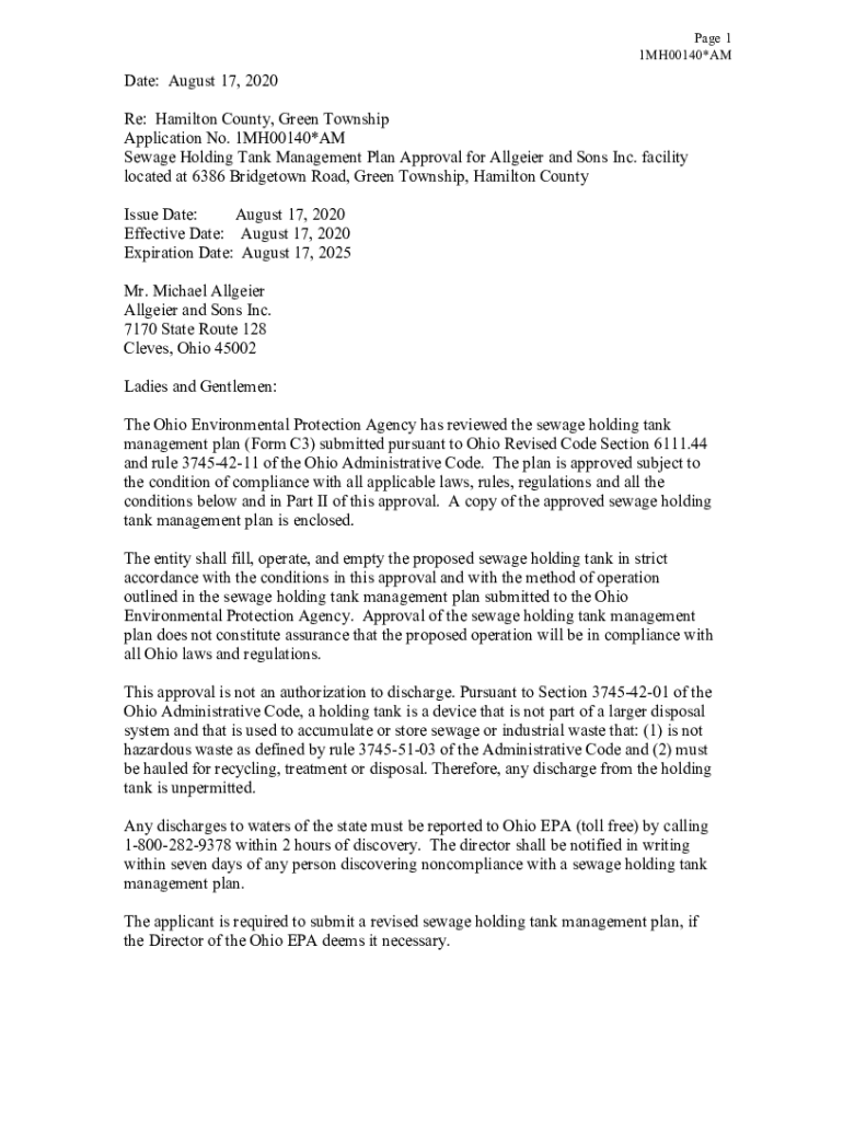 Page 1 1MH00140×AMD ate: August 17, 2020, Re: Hamilton County, Green Township Application No. 1MH00140×AM Sewage Holding Tank Management Plan Approval for Appear and Sons Inc. facility located at