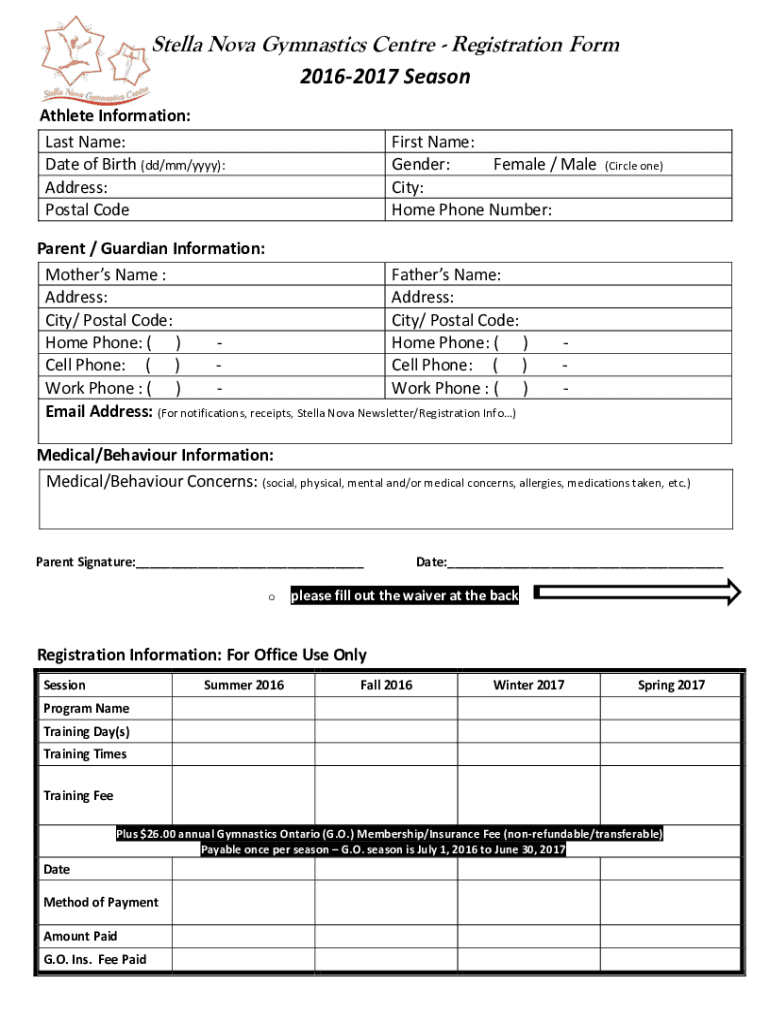 Stella Nova Gymnastics Center Registration Form 20162017 Season Athlete Information: Last Name: Date of Birth (dd/mm/YYY): Address: Postal Coexist Name: Gender: Female / Male City: Home Phone Number:Parent