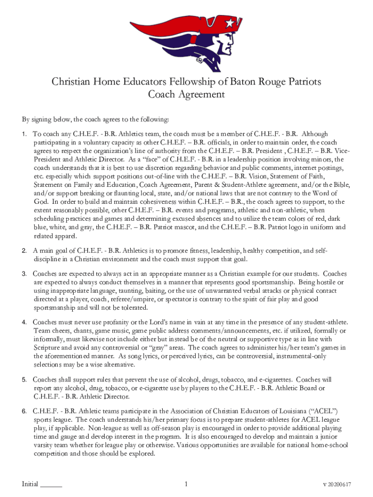 Christian Home Educators Fellowship of Baton Rouge Patriots Coach Agreement By signing below, the coach agrees to the following: 1. To coach any C.H.E.F. B.R. Athletics team, the coach must be a member