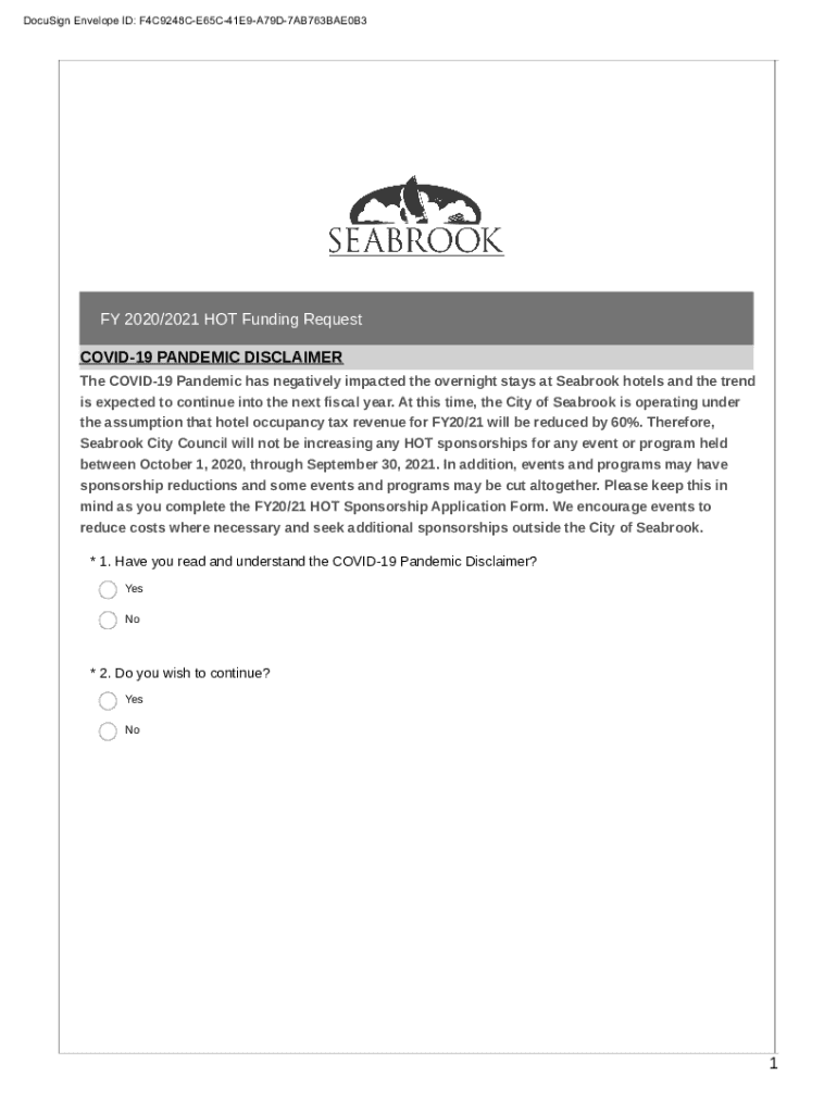 DocuSign Envelope ID: F4C9248CE65C41E9A79D7AB763BAE0B3FY 2020/2021 HOT Funding Request COVID-19 PANDEMIC DISCLAIMER The COVID-19 Pandemic has negatively impacted the overnight stays at Seabrook hotels