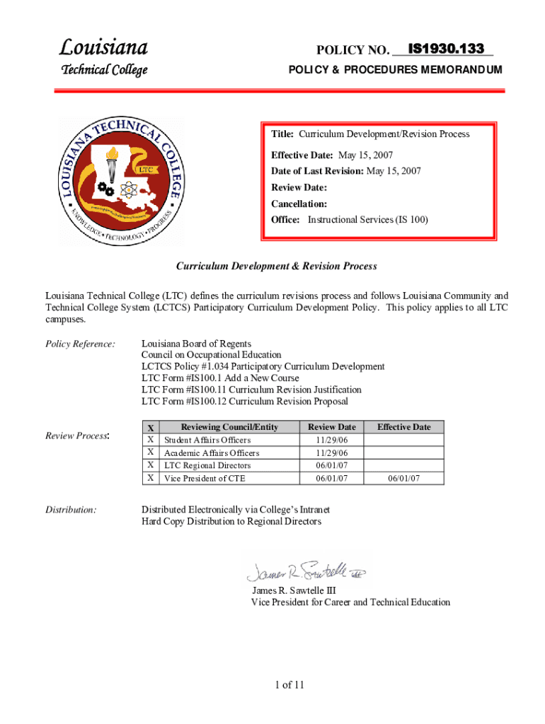 LouisianaIS1930.133 POLICY NO. Technical CollegePOLICY & PROCEDURES MEMORANDUMTitle: Curriculum Development/Revision Process Effective Date: May 15, 2007, Date of Last Revision: May 15, 2007, Review