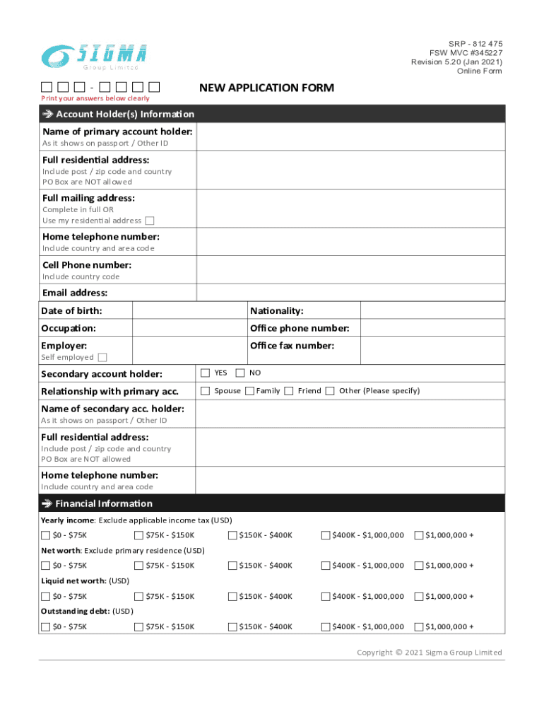 SRP 812 475 FSW MVC #345227 Revision 5.20 (Jan 2021) Online Form Print your answers below clearly APPLICATION FORM Account Holder(s) Information Name of primary account holder: As it shows on passport