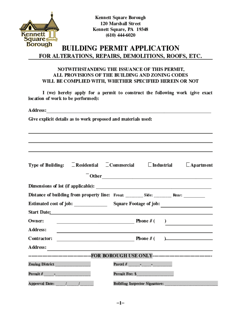 Kennett Square Borough 120 Marshall Street Kennett Square, PA 19348 (610) 4446020BUILDING PERMIT APPLICATION FOR ALTERATIONS, REPAIRS, DEMOLITIONS, ROOFS, ETC. NOTWITHSTANDING THE ISSUANCE OF THIS