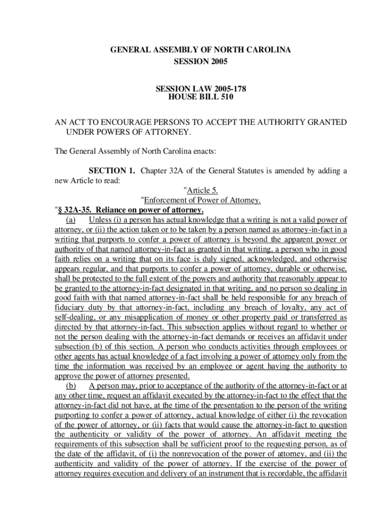 GENERAL ASSEMBLY OF NORTH CAROLINA SESSION 2005 SESSION LAW 2005178 HOUSE BILL 510 AN ACT TO ENCOURAGE PERSONS TO ACCEPT THE AUTHORITY GRANTED UNDER POWERS OF ATTORNEY. The General Assembly of North